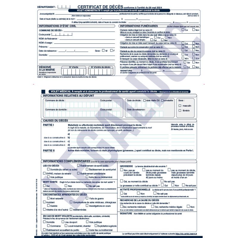 Formulaire officiel de certificat de décès conforme à l'arrêté du 29 mai 2024. Obligatoire pour les professionnels de santé constatant un décès.