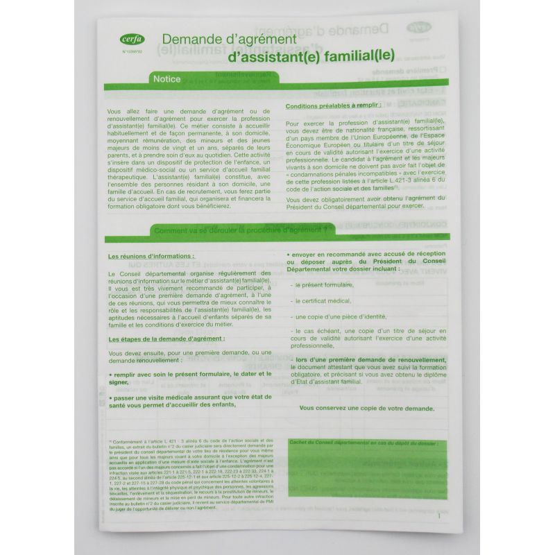Le CERFA N°13395-02 est le formulaire administratif officiel à remplir pour demander un agrément d'assistant(e) familial(e). Cet agrément est obligatoire pour toute personne souhaitant accueillir des enfants confiés par l’aide sociale à l’enfance (ASE).