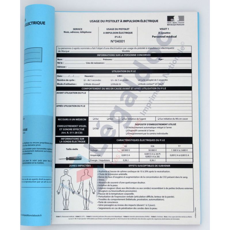 Le carnet "Fiche d'information - Usage du pistolet à impulsion électrique (PIE)" est composé de 25 liasses de 5 feuillets autocopiants.