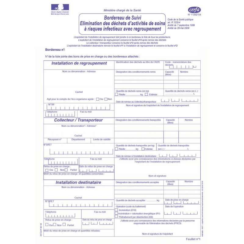 Bordereau de suivi : déchets d'activités de soins à risque infectieux Cerfa 11351*04 Bordereau de suivi des déchets d'activités de soins à risques infectieux Liasse de 4 feuillets Format A4