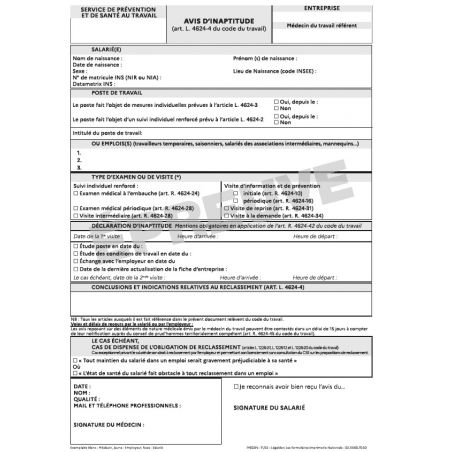 Avis d'inaptitude à compléter dans le cadre d'un suivi individuel renforcé en raison de son affectation à un poste mentionné à l'article R. 4624-23