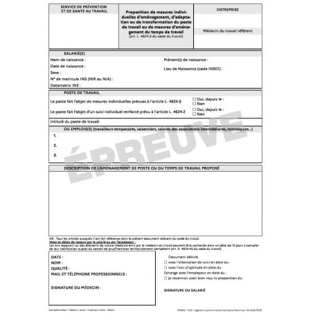 Proposition de mesures individuelles d'aménagement, d'adaptation ou de transformation du poste de travail ou de mesures d'aménagement du temps de travail, complétée par le médecin accompagnera selon les cas soit l'attestation de suivi OU l'avis d'aptitude