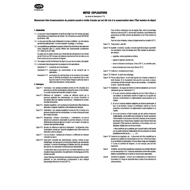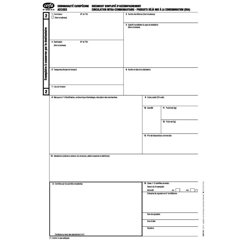 Certificat d’origine – Liasse 6 feuillets Cerfa 11012*01Certificat d'origine, liasse de 6 feuillets - Liasse autocopiante de 6 feuillets - Format 21 x 29.7 - 1 original (fond guilloché) recto seul...