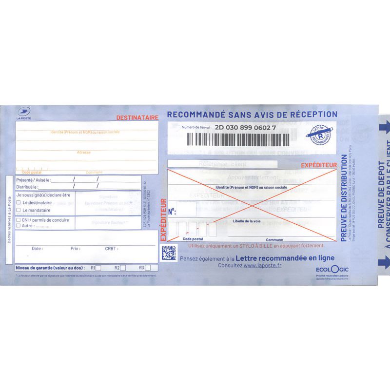 Ils comprennent 3 feuillets : preuve de dépôt, preuve de distribution et avis de passage, garantissant le suivi de votre envoi recommandé sans signature.
